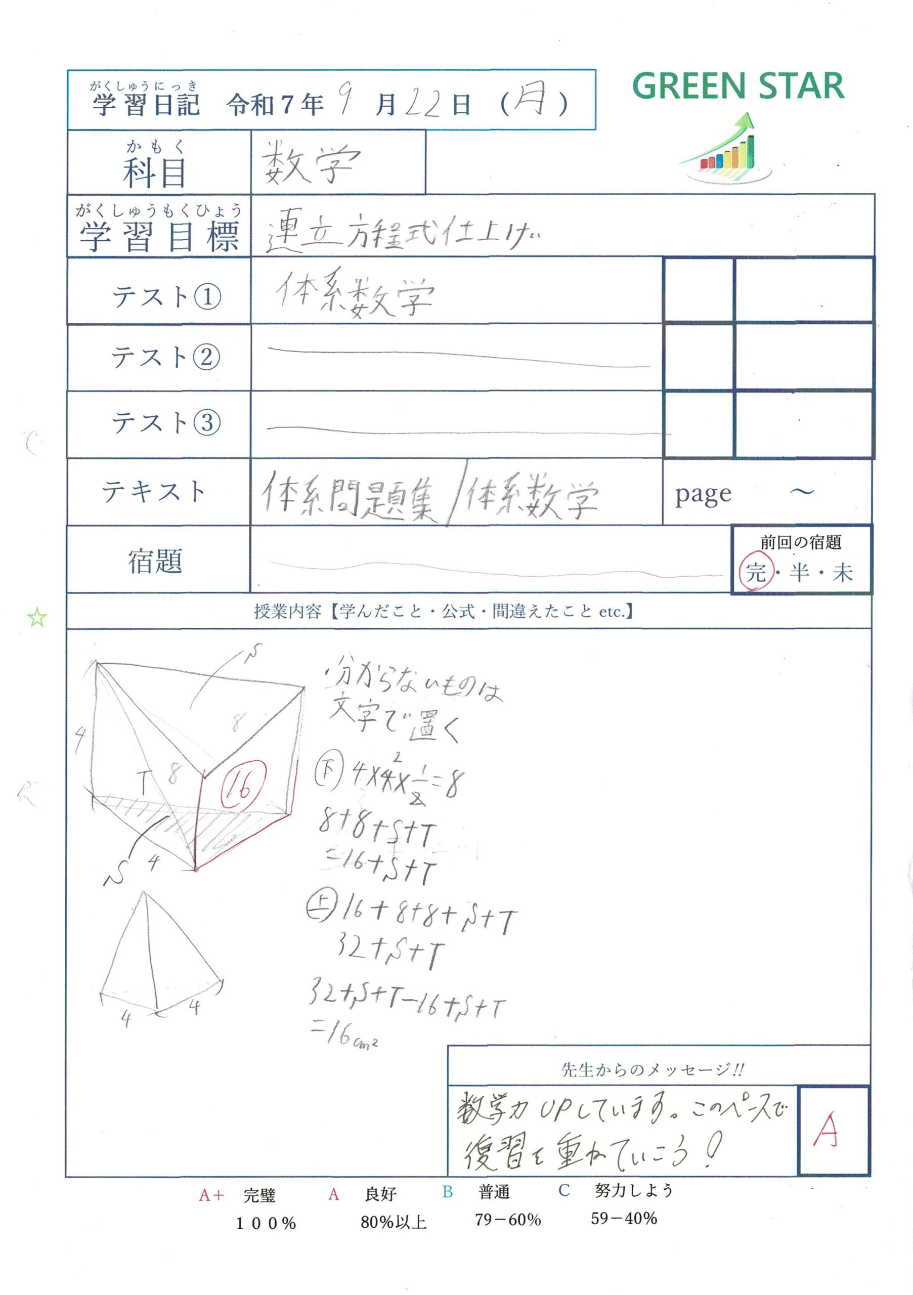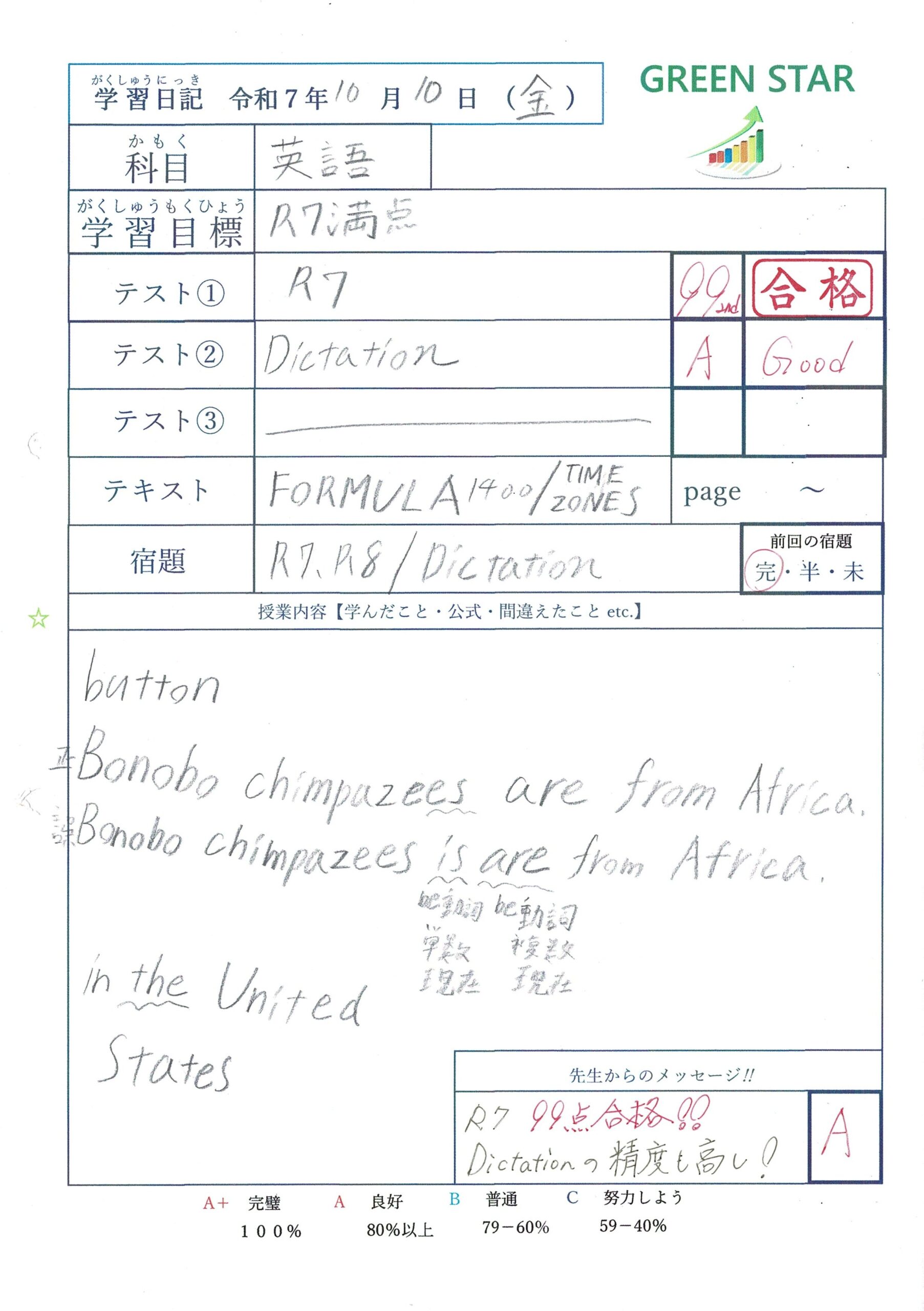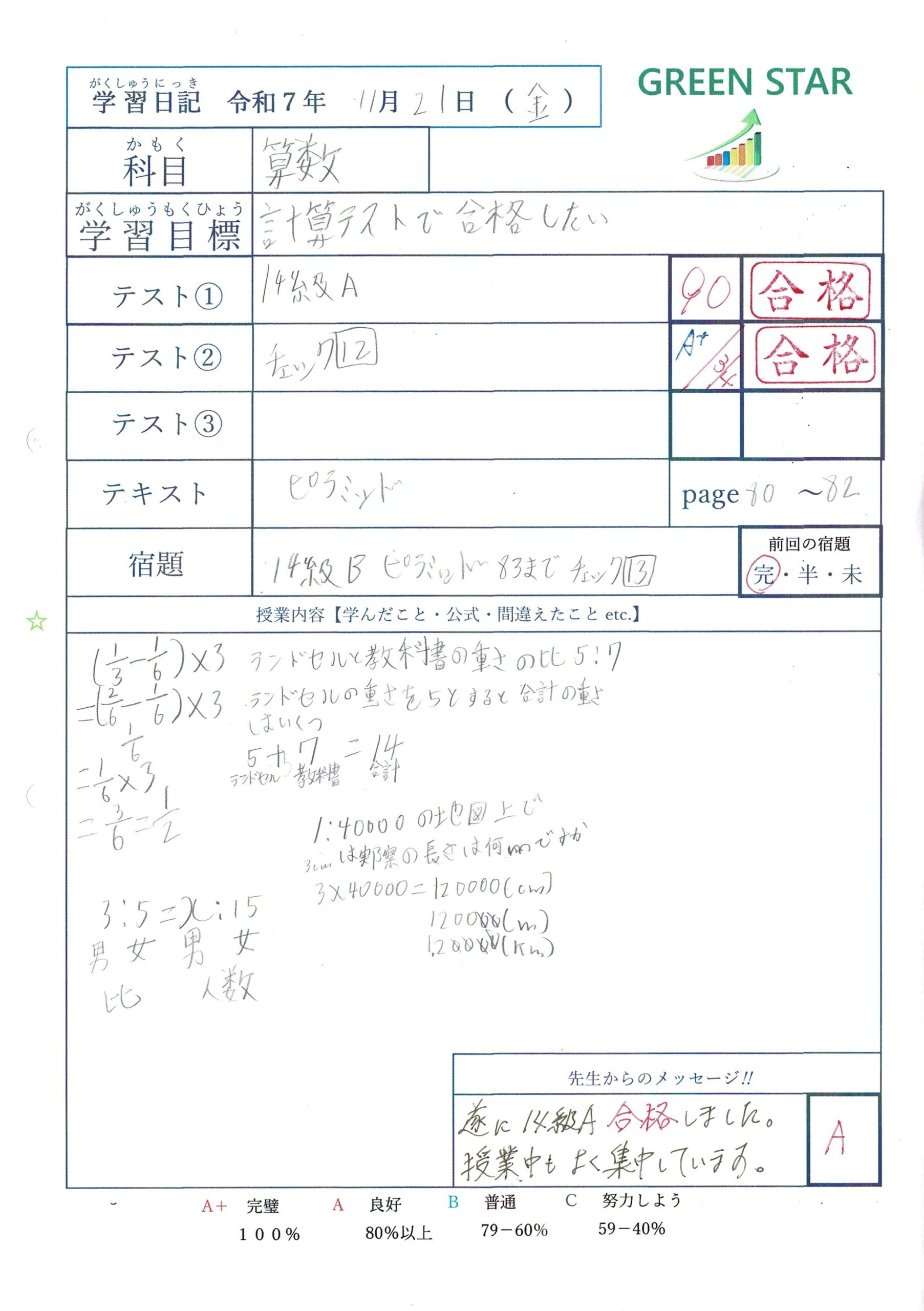 また最後に私から手書きのコメントと評価を